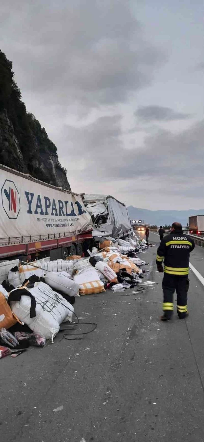 Olay sabah saatlerinde meydana geldi. Hopa istikametinden Sarp Sınır Kapısında gitmekte olan Azerbaycan plakalı tır sürücüsü, park halinde duran başka bir tıra arkadan çarptı. Çarpmanın etkisiyle yaralanan sır sürücüsü Hopa İtfaiye ekiplerince sıkıştığı yerden çıkartılarak sağlık ekiplerine teslim edildi. Yaralı tır sürücüsünün durumunun iyi olduğu öğrenilirken, kaza sonrası tır içinde bulunan yük malzemeleri etrafa yayıldı.