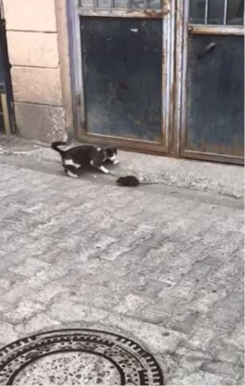 Artvin’de sokak ortasında insanlardan korkmayan fare, kendisini fark ederek üzerine yürüyen kediye karşılık verdi. Neye uğradığını şaşıran kedi, fareden kaçarken o anlar ise yoldan geçen bir kişi tarafından cep telefonu tarafından kaydedildi.