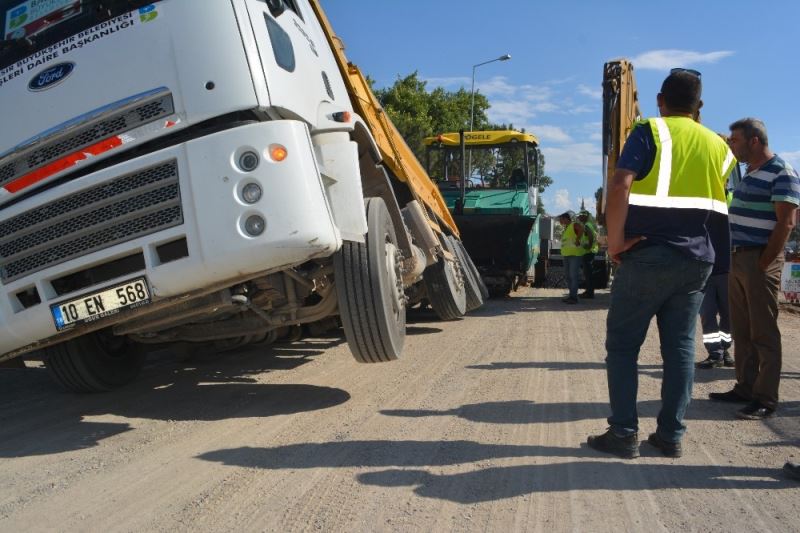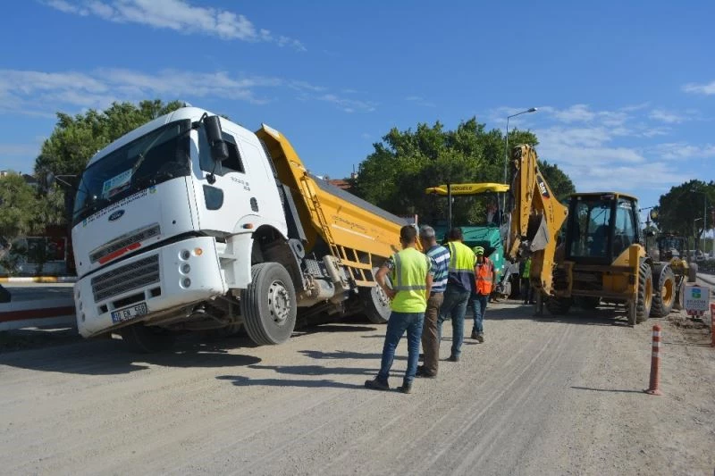 Balıkesir Büyükşehir Belediyesi’nin Eski Garaj önünde döktüğü asfalt çalışması sırasında kasası zift ve asfalt malzemesi yüklü kamyon bir anda çöken yolda mahsur kaldı. Eski ve kullanılmayan bir kanalizasyon şebekesinin geçtiği zemine gömüldüğü öğrenilen kamyonun hemen yanında bulunan 2 işçi olası bir felaketten saniyeler farkıyla kurtuldu.