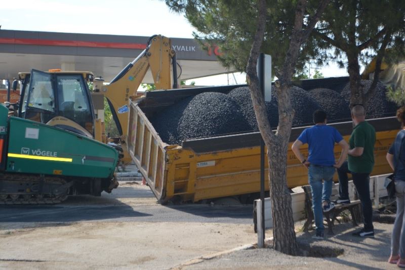 Balıkesir’in Ayvalık ilçesinde ana arter üzerinde yapılan asfalt çalışmaları sırasında yol çöktü. Çöken yola devrilen kamyonun yanında bulunan 2 işçi olası bir felaketten saniyelerle kurtuldu.
