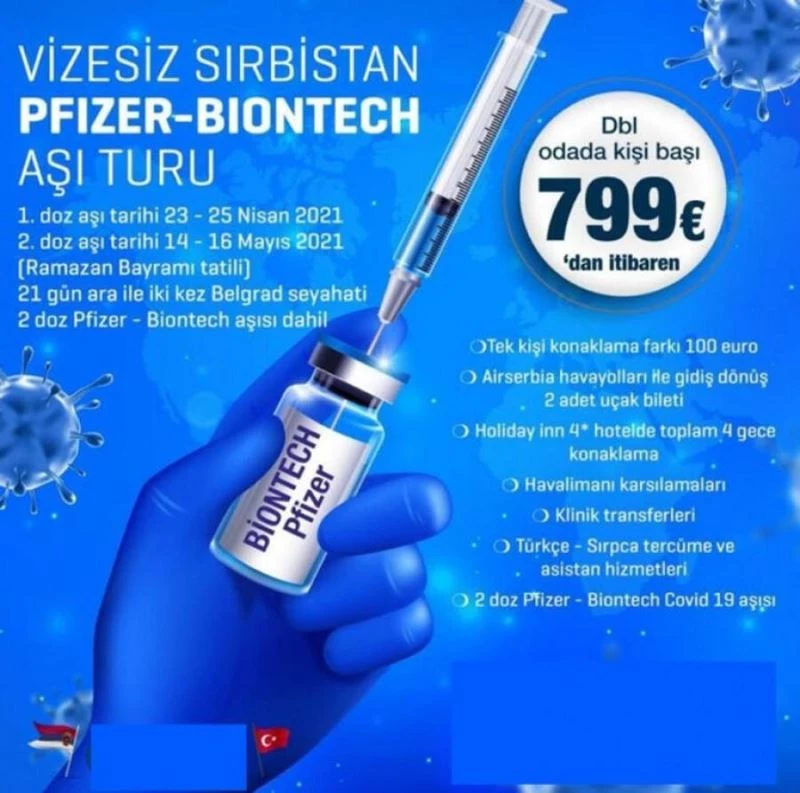 7 milyon nüfusuna rağmen 15 milyon aşı dozu almayı başaran Sırbistan, kendi vatandaşlarını aşı olmaya ikna edemediğinden bunu turizm için kullanıyor. Ülkede AstraZeneca, Pfizer, Sinopharm ve Sputnik V’den oluşan bir menü mevcut. Rusya da uluslararası turistleri sadece aşı yaptırmak amacıyla karşılama kabul eden ülkelerden.