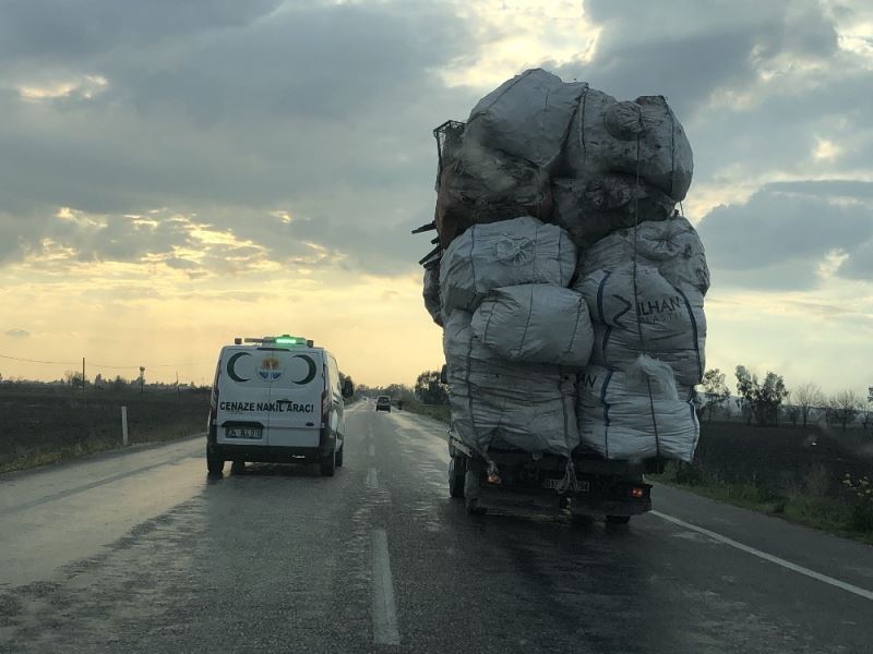 Kadirli-Kozan karayolunda 01 ABM 894 plakalı aşırı hurda yükü taşıyan kamyonun trafikte tehlike saçtığı anlar kameralara yansıdı. Kasasına iplerle metrelerce yüksek çuval yığını bağlayan ve virajlarda devrilme riski yaşayan kamyonun sürücüsü yaşadığı tehlikeye aldırmadan yoluna devam etti.