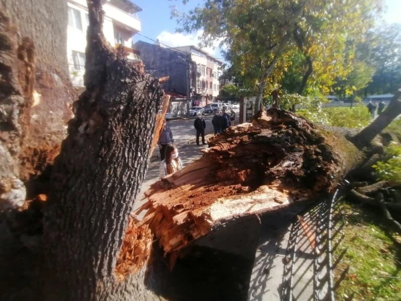 Vatandaşların ihbarı üzerine olay yerine gelen Büyükşehir Belediyesi Park ve Bahçeler Şube Müdürlüğü ekipleri devrilen ağacı elektrikli testerelerle keserek parçaladı.