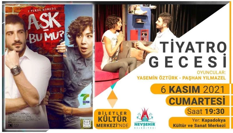 Nevşehir Belediyesi Kültür ve Sosyal İşler Müdürlüğü tarafından düzenlenen Tiyatro Geceleri yeniden başlıyor. Etkinlikler kapsamında ilk olarak Onur Sermik’in yazıp, Yasemin Öztürk ve Paşhan Yılmazel’in oynadığı “Aşk Bu Mu?” adlı tiyatro oyunu, 6 Kasım Cumartesi günü saat 19.30’da Kapadokya Kültür ve Sanat Merkezi’nde sahnelenecek. Tiyatro severler oyun için biletlerini 5 TL karşılığında Nevşehir Belediyesi Kapadokya Kültür ve Sanat Merkezi’nden alabilecek. 12 yaş altındaki çocukların ve biletsiz izleyicilerin alınmayacağı oyuna sanatseverlerin büyük ilgi göstermesi bekleniyor.