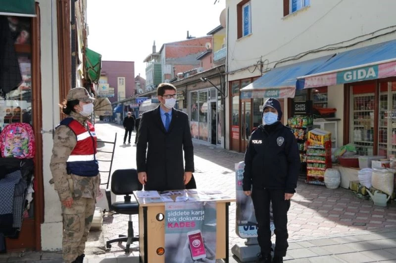 İlçe Emniyet ve Jandarma Komutanlığına ait ekiplerin ilçe merkezinde kurdukları standla vatandaşlara ve özellikle kadınlara bilgiler verdiler.