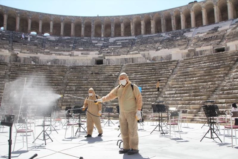 ANTALYA (AA) - Bu yil 27'ncisi düzenlenen "Uluslararasi Aspendos Opera ve Bale Festivali" öncesi Aspendos Antik Tiyatrosu, yeni tip koronavirüs (Kovid-19) tedbirleri kapsaminda dezenfekte edildi.