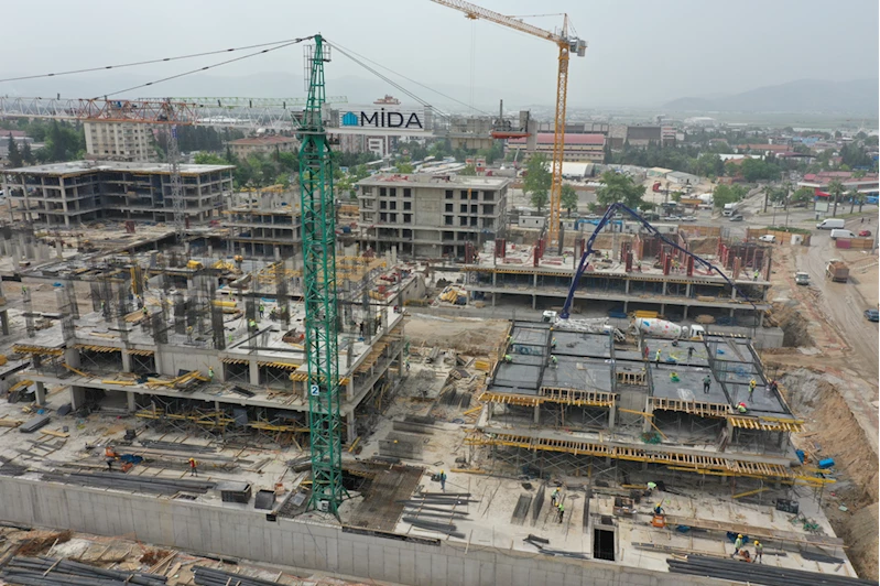 Azerbaycan ile Toplu Konut İdaresi Başkanlığının (TOKİ) projesi kapsamında Hayrullah Mahallesi'nde yapımı süren 3 bin 500 konut ile iş yerleri yükselmeye devam ediyor.
