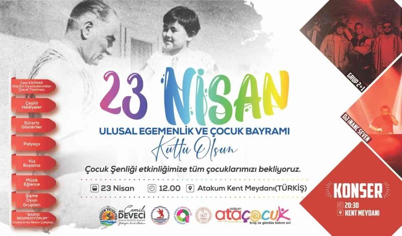 Türkiye Büyük Millet Meclisi’nin kuruluşunun 102. yıl dönümü olan 23 Nisan Ulusal Egemenlik ve Çocuk Bayramı, Atakum Belediyesi’nce dolu dolu kutlanacak. 2020 ve 2021 yıllarında koronavirüs önlemleri nedeniyle marşlar konvoyu, Ulusal Egemenlik Bandosu, site konserleri ve sokak sanatçılarının gösterileriyle kutlanan 23 Nisan Ulusal Egemenlik ve Çocuk Bayramı, bu defa Ondokuz Mayıs Üniversitesi (OMÜ), Atakum Kent Konseyi Çocuk Meclisi, Atakum Belediyesi AtaÇocuk Kreş ve Gündüz Bakımevi ile Özel Anaokulu ve Kreş Eğitimcileri Derneği (SAKED) iş birliği ile Atakum Kent Meydanı’nda (Emek Park) düzenlenlenecek etkinliklerle kutlanacak. Saat 12.00’de başlayacak kutlama programı 20.30’da gerçekleştirilecek iki konserin ardından son bulacak.