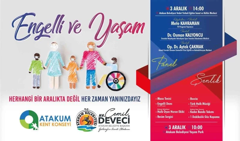Atakum Belediyesi ve Atakum Kent Konseyi iş birliği ile 3 Aralık Dünya Engelliler Günü etkinlikleri kapsamında "Herhangi bir aralıkta değil, her zaman yanınızdayız" başlıklı panel ve şenlik programı gerçekleştirilecek. Program saat 10.00’da Atakum Yaşam Park’ta düzenlenecek sanat ve spor şenliği ile başlayacak. Saat 14.00’te Vedat Türkali Eğitim, Sanat ve Kültür Merkezi’nde düzenlenecek panel etkinliği olmak üzere iki bölüm halinde gerçekleştirilecek.
