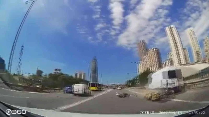 Ataşehir’de emniyet şeridinde hızla ilerleyen motosiklet sürücüsü, direksiyon hakimiyetini kaybederek yol kenarında park halinde bulunan servis aracına çarptı. Motosiklet sürücüsü, çarpmanın etkisiyle yola savruldu. Sürücü o esnada yoldan geçen bir başka aracın altında kalmaktan son anda kurtuldu. Yaşanan kaza anı araç kamerasına yansıdı.