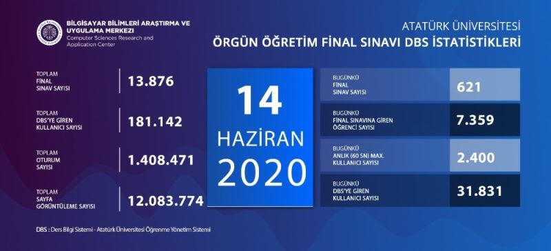 1-14 Haziran 2020 tarihleri arasında gerçekleşen örgün öğretim final sınavlarında toplam 12 Milyon sayfa görüntülenmesi sağlanırken 1 Milyon 408 Bin oturum gerçekleştirildi. 63 farklı ülkeden final sınavlarına katılan öğrenciler, sınavlarına en çok mobil cihazlarından bağlanarak katılım sağladı.