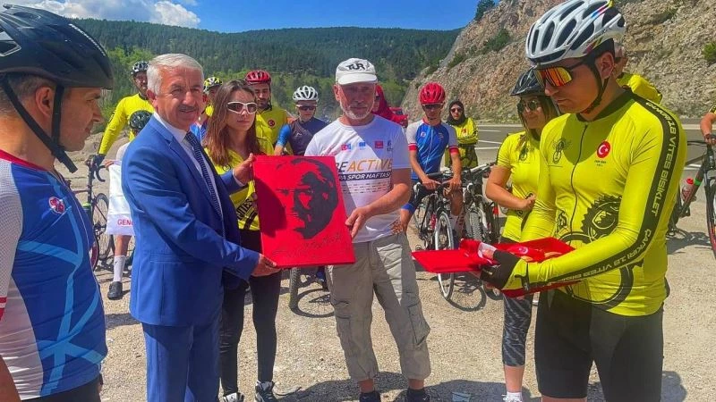 Çankırılı bisikletliler Karabük sınırından aldıkları toprak ve Türk bayrağını Tosya sınırında Kastamonu ekibine teslim etti.