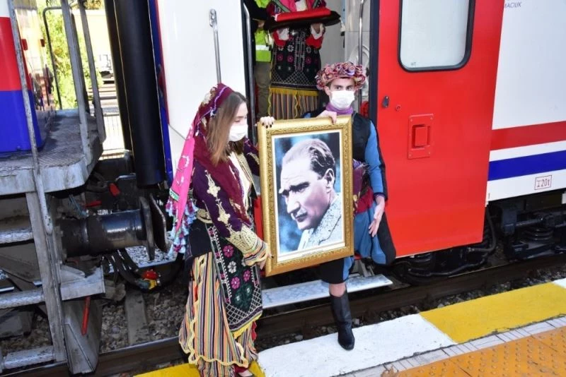Gazi Mustafa Kemal Atatürk’ün Manisa’ya gelişinin 95’inci yıldönümü dolayısıyla ilk olarak Manisa Tren Garı’nda temsili karşılama töreni gerçekleştirildi. Atatürk’ün Manisa’ya trenle gelişinin canlandırıldığı törende, öğrenciler Atatürk fotoğrafı ile trenden inerek, Türk Bayrağı’nı Vali Yaşar Karadeniz’e takdim etti. Vali Karadeniz, bayrağı öpüp alnına koyduktan sonra öğrencilerle birlikte protokol üyeleri günün anısına hatıra fotoğrafı çektirdi. Tren garındaki etkinlik, Manisa Büyükşehir Belediyesi tarafından hazırlanan Atatürk fotoğrafları sergisinin gezilmesiyle noktalandı. Daha sonra Vali Yaşar Karadeniz, Milletvekilleri Özgür Özel, Bekir Başevirgen, Manisa Büyükşehir Belediye Başkanı Cengiz Ergün ve protokol üyeleri, önlerinde öğrenciler tarafından tutulan dev Türk Bayrağı ve Atatürk portresi ile Cumhuriyet Meydanı’na kadar yürüdü. Vatandaşlar, korteji kaldırımdan ve evlerinden selamlayarak, Türk Bayrağı ve alkışlarıyla eşlik etti. Manisa Büyükşehir Belediyesinin Kent Estetiği Dairesi Başkanlığı bünyesinde çalışan kadın işçileri de, Türk bayraklarıyla protokolü selamlarken, renkli görüntüler oluşturdular.