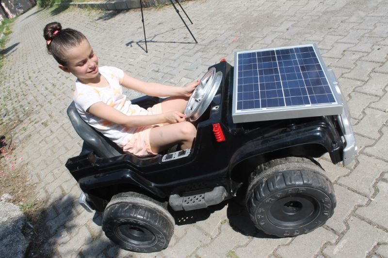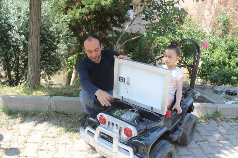 Atık malzemelerle kızına güneş panelli akülü araç yaptı