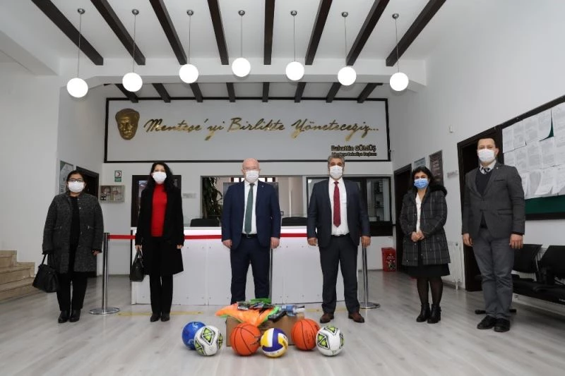 Başkan Gümüş konuşmasının ardından Okul Müdürü Güven Özgül’e yarışmanın ikincilik ödülü olan spor malzemeleri setini takdim etti.