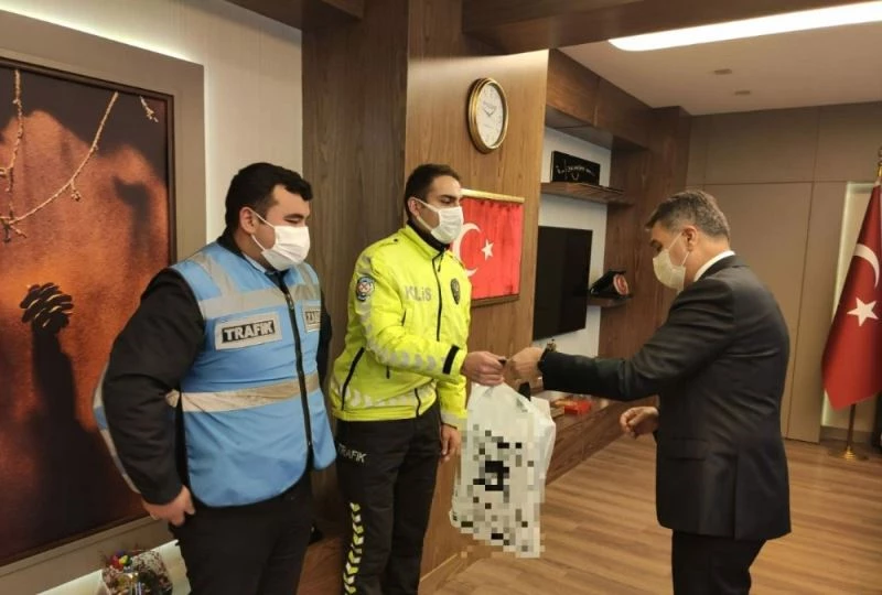 Makamında trafik polislerini ağırlayan Emniyet Müdürü Zeybek, iki polis memurunu duyarlığı nedeniyle kutladı. Zeybek, davranışları nedeniyle ödüllendirdiği trafik polislerine hediyeler de verdi.
