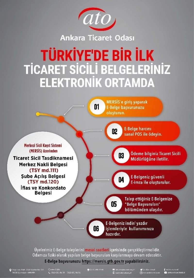 Ankara Ticaret Odası’ndan (ATO) yapılan yazılı açıklamaya göre ATO bünyesinde faaliyetlerini sürdüren ve Türkiye’de pilot olarak seçilen Ankara Ticaret Sicili Müdürlüğü’nün verdiği “Ticaret Sicil Tasdiknamesi”, “Merkez Nakli Belgesi”, “Şube Açılış Belgesi” ve “İflas ve Konkordato Belgeleri” 14 Mayıs tarihinden itibaren ATO üyelerine elektronik ortamdan verilmeye başlandı.