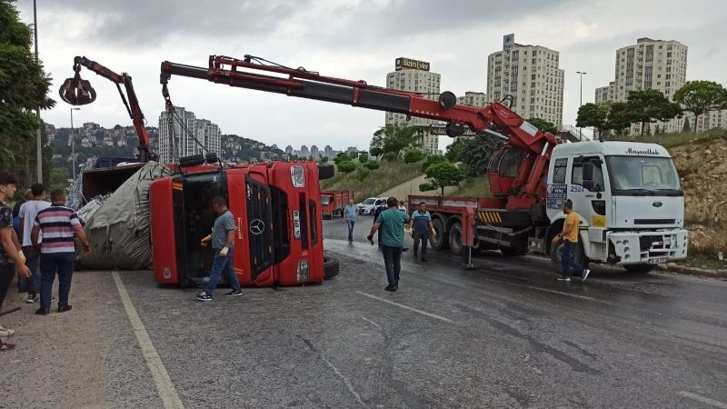 Avcılar’da metal hurda yüklü kamyon rampa yukarı çıkarken yan yatarak devrildi. Yaralanan sürücü, ambulans ile hastaneye kaldırıldı.