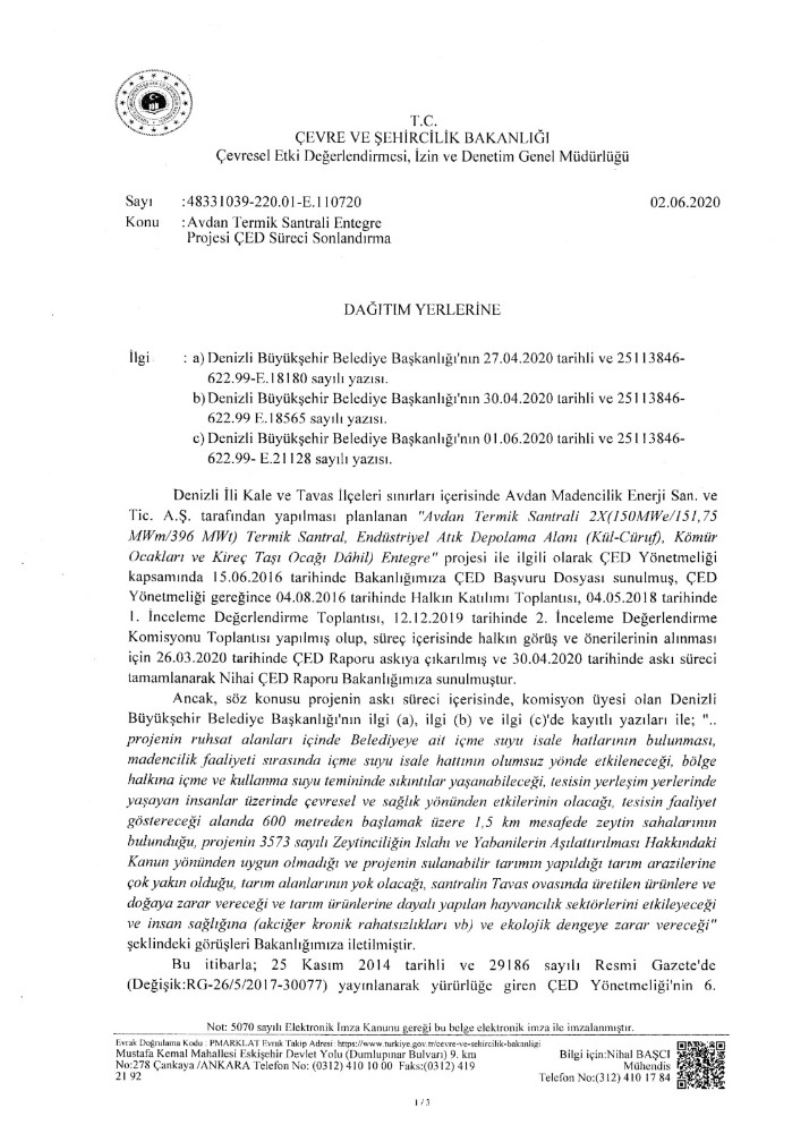 Denizli’nin Kale ile Tavas ilçesi sınırlarında yapımı planlanan ve uzun bir süredir gündemde olan “Avdan Termik Santrali” projesi iptal edildi. Konuyla ilgili açıklamalarda bulunan Denizli Büyükşehir Belediye Başkanı Osman Zolan, "Göreve geldiğimiz ilk günden itibaren doğa ve çevre konusundaki hassasiyetimizi net bir şekilde ortaya koyduk, koymaya da devam ediyoruz. Çevre ve insan sağlığı ile ilgili projelerimizle Türkiye’nin en çevreci belediyesi, en sağlıklı şehri ve en temiz kenti ödüllerini aldık. Bunların yanında hayata geçirdiğimiz yeşil alanlar, parklar, katı atık bertaraf tesisleri, atık su arıtma tesisleri ve sayısız projemizle doğa ve çevre konusuna verdiğimiz önemi ortaya koyduk. Tavas ilçemizin Avdan Mahallesi’nde yapılması düşünülen termik santralle ilgili de hassasiyetimizi en baştan itibaren ortaya koyduk. Üzerimize düşen ne varsa her birini özenle yerine getirip konunun yakın takipçisi olduk. Çevre ve Şehircilik Bakanlığımıza, Avdan Termik Santrali ile ilgili tüm teknik analizlerimizle birlikte 27.04.2020, 30.04.2020 ve 01.06.2020 tarihlerinde gerekli itirazlarımızı yaptık. Çevre ve Şehircilik Bakanlığımız da Denizli Büyükşehir Belediyemizin söz konusu itirazlarını dayanak göstererek Avdan Termik Santrali ÇED sürecini sonlandırdı, projeyi iptal etti. İtirazlarımız doğrultusunda ÇED sürecini sonlandıran, Çevre ve Şehircilik Bakanımız Sayın Murat Kurum’a, çevre başta olmak üzere bugüne kadar Denizlimize bir çok hizmeti bulunan ve bu süreçte de yanımızda olan önceki dönem Ekonomi Bakanımız Sayın Nihat Zeybekci’ye, ayrıca bu konuda hassasiyet gösteren tüm hemşehrilerime teşekkür ediyorum" dedi.