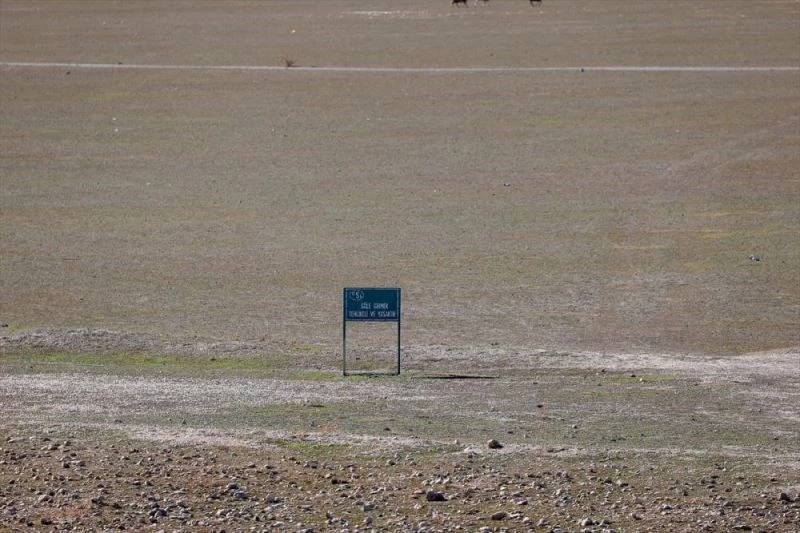 Önceden kıyıda bulunan ve suyun çekilmesiyle iç kısma taşınan "Göle girmek tehlikeli ve yasaktır" levhasının kurak bölgenin ortasında kalması dikkati çekiyor.