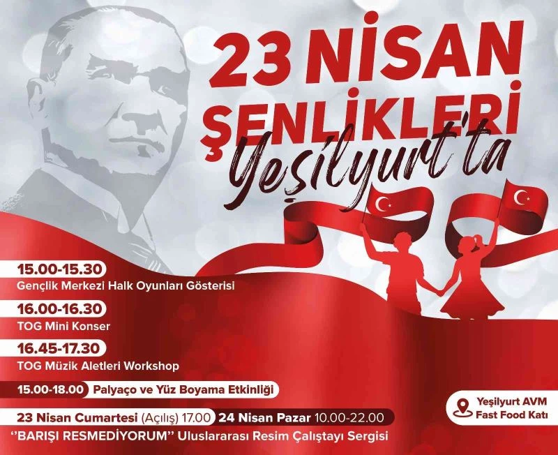 Samsun’un çekim merkezi Yeşilyurt AVM, 23 Nisan Ulusal Egemenlik ve Çocuk Bayramı’na özel 23 Nisan’da Yeşilyurt AVM fast food katında kurulacak aktivite alanında saat 15.00-15.30 arasında Atakum Gençlik Merkezi katkılarıyla "halk oyunları gösterisi" ardından 16.00-16.30 arası TOG (Toplum Gönüllüleri Vakfı) Samsun İğne Deliği Gençlik Merkezi gönüllülerinden oluşan, Samsun’un sevilen müzik grubu 2 Oda 1 Salon’un mini konseri ile çocuk şarkıları eşliğinde minik misafirlerine unutulmaz anlar yaşatacak. Ardından 16.45-17.30 arasında da mini konserde kullanılan müzik aletlerinin tanıtılması adına "müzik aletleri workshop" etkinliği gerçekleştirilecek. Ücretsiz olarak düzenlenecek etkinlikler devam ederken 15.00-18.00 arası "palyaço ve yüz boyama" etkinliği ile çocuklar 23 Nisan ruhunu doyasıya yaşayacak.