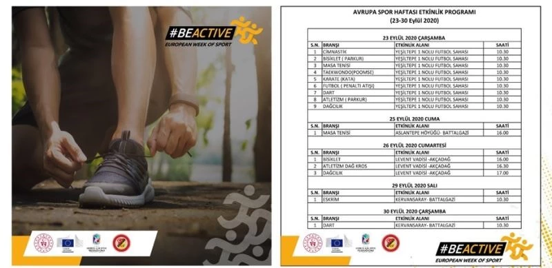 Avrupa Spor Haftası müsabakaları 23-30 Eylül tarihleri arasında düzenlenecek. Hafta boyunca, Herkes İçin Ulusal Spor ve Sağlık Günleri etkinlikleri gerçekleştirilecek olmakla birlikte, proje paydaşları işbirliğinde spor ve sağlıklı yaşam konusunda farkındalık oluşturucu çeşitli etkinlikler gerçekleştirilecek.