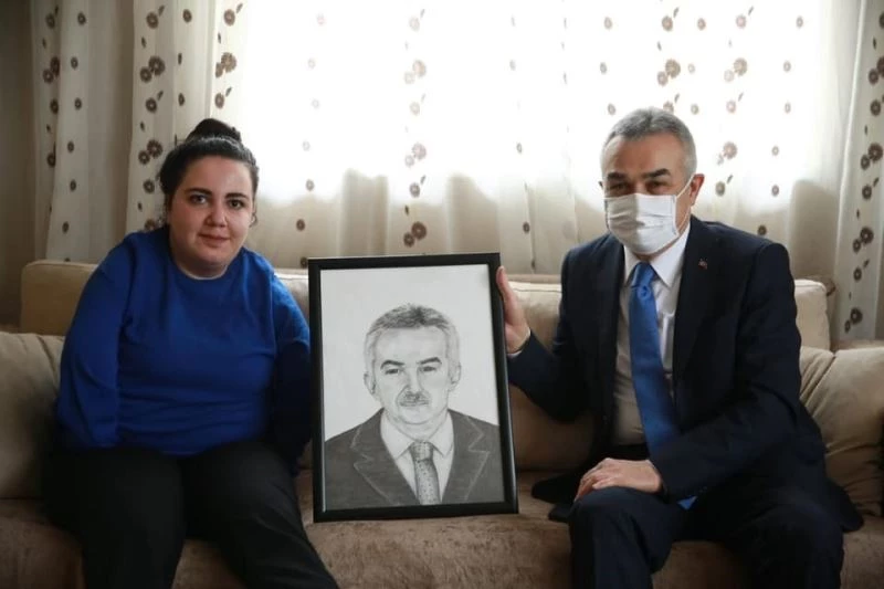 Ayağı ile çizdiği kara kalem portreyi Milletvekili Savaş’a hediye etti