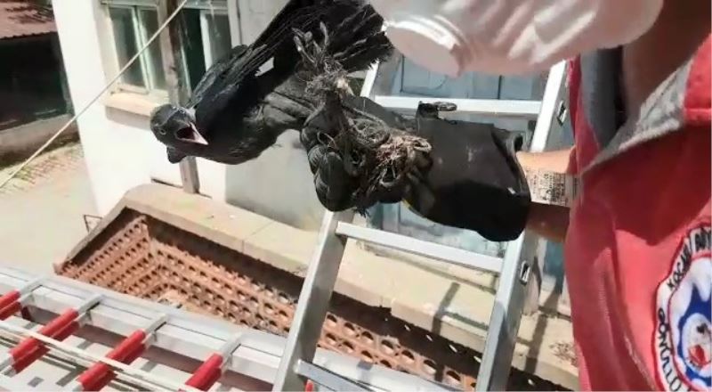 Kocaeli’nin Gebze ilçesinde 2 katlı bir evin çatısına yaptığı yuvada ayağı ipe takılan karga itfaiye ekipleri tarafından kurtarıldı. Binanın çatısını saran karga sürüsünün saldırısına rağmen itfaiye eri, kurtarma çalışmasını başarı ile sonlandırdı.