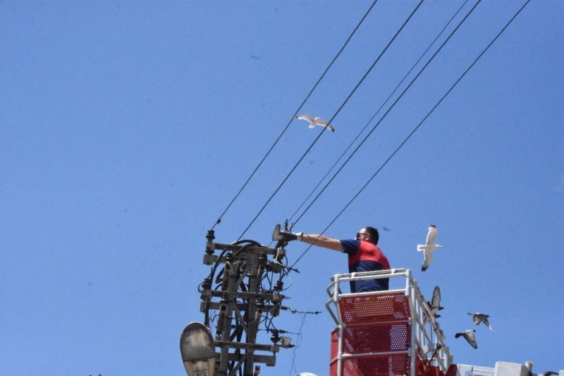 Sinop’ta ayağı elektrik direğindeki tele takılan güvercin, itfaiye merdiveni yardımıyla kurtarıldı.