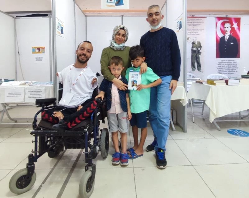 Bedensel engelli milli yüzücü Sefa Yurtkölesi, Manisa’da 4. Kitap fuarında, ilk eseri olan ve ayaklarını kullanarak yazdığı Hayatın Sefa’sı kitabını okuyucularına ayaklarıyla imzaladı.