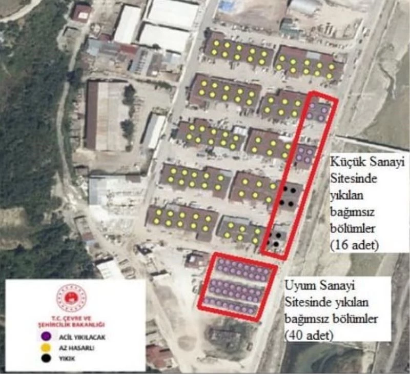 Geçtiğimiz aylarda yapılan çalışmalarda Küçük Sanayi Sitesi’nde 120 metrekare taban oturumuna sahip 16 adet, Uyum Sanayi Sitesi’nde ise 42 metrekare taban oturumuna sahip 40 adet bağımsız bölümün hasar tespiti, yıkımı ve enkaz kaldırma işlemleri Çevre ve Şehircilik İl Müdürlüğü koordinasyonunda gerçekleştirildi.