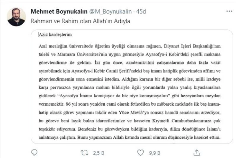 Ayasofya-i Kebir Cami-i Şerifi İmamı Prof. Dr. Mehmet Boynukalın, istifasına ilişkin açıklama yaptı. Boynukalın, “Akademik çalışmalarıma daha fazla vakit ayırabilmek için baş imam hatiplik görevimden affımı ve görevlendirmemin sona ermesini istedim. Aldığım kararın bir diğer sebebi ise, milli iradeye karşı pervasızca yayınlanan malum bildiriyle ilgili yorumlarda yalan yanlış kıyaslamalara gidilerek ’Ayasofya İmamı konuşuyor da biz niye konuşamayalım’ gibi hezeyanlara meydan vermemektir” ifadelerini kullandı.