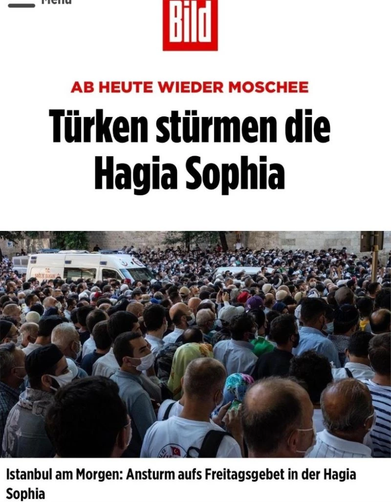 Bild gazetesi ise Ayasofya-i Kebir Cami-i Şerifi önünden çekilmiş fotoğraflarla servis ettiği haberinde binlerce insanın cami etrafında ibadet etmek için beklediğine dikkat çekti. Gazete, 20 bin polisin görev yaptığını belirterek, camiye gelenlerin maske takması ve sosyal mesafeye uymaları konusunda uyarıldığını yazdı.