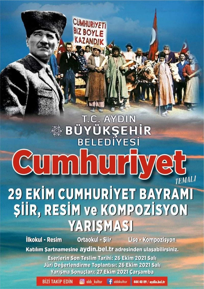 29 Ekim 1923 tarihinde Türkiye Büyük Millet Meclisi tarafından Cumhuriyet’in ilan edilmesi, bu yıl da tüm yurtta coşku ile kutlanacak. Büyük Önder Gazi Mustafa Kemal Atatürk’ün liderliğinde ilan edilen Cumhuriyet’in genç kuşaklar tarafından daha iyi kavranması ve bu güçlü geçmişi eserleriyle anmalarını sağlamak için; Aydın Büyükşehir Belediyesi tarafından Cumhuriyet temalı bir yarışma düzenleniyor. Aydın’da öğrenim gören ilkokul, ortaokul ve lise düzeyindeki öğrenciler, Cumhuriyet temalı resim, şiir ve kompozisyon eserleri ile yarışacaklar.