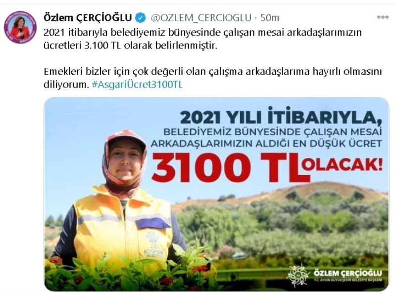 Aydın Büyükşehir Belediye Başkanı Özlem Çerçioğlu sosyal medya hesabından yaptığı paylaşımda, “2021 itibarıyla belediyemiz bünyesinde çalışan mesai arkadaşlarımızın ücretleri 3.100 TL olarak belirlenmiştir. Emekleri bizler için çok değerli olan çalışma arkadaşlarıma hayırlı olmasını diliyorum. Asgari Ücret 3100 TL.” ifadelerine yer verdi.