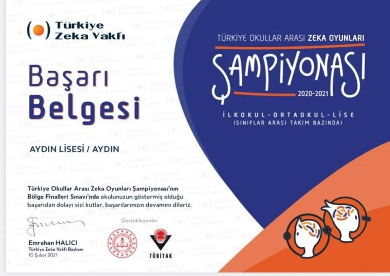 Milli Eğitim Bakanlığı’nın izni ve TÜBİTAK’ın destekleri ile düzenlenen, Türkiye Okullar Arası Zeka Oyunları’nın il finalleri geçtiğimiz Kasım ayında gerçekleştirildi. 23 Ocak da Ege bölge elemelerinde, il finallerinde ilk 5 sırayı alan okullar ve bunlara ek olarak da il finalleri Sınavında ilk yüzde 30’luk dilime girip illerini temsil eden bütün okulları geride bırakan Aydın Lisesi Zeka Oyunları Takımı ‘Türkiye Okullar Arası Zeka Oyunları Şampiyonası’nda Türkiye finallerine kalmayı başardı. Türkiye finalleri sınavına Türkiye’nin 7 coğrafi bölgesi dikkate alınarak her bölgedeki bölge finalleri sınavında ilk 5 sırayı alan 35 okul ve bu okullar dışında bölge finalleri sınavında ilk sırayı alan 65 okul olmak üzere toplam 100 okul katılacak. Aydın Lisesi Zeka Oyunları Takımı da 20 Mart 2021 tarihinde yapılacak Türkiye Finalleri Sınavı’nda Aydın’ı temsil edecek.