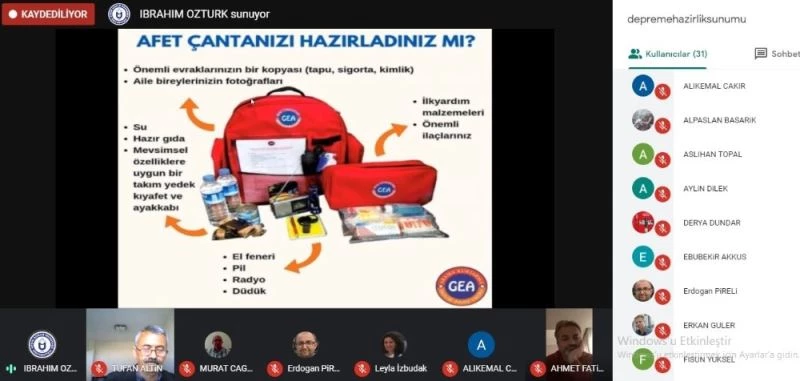 İnşaat Teknolojisi Programı Öğretim Görevlisi, Arama-Kurtarma gönüllüsü, Temel ve İleri SAR (Search and Rescue) Eğitimleri ile çeşitli arama kurtarma tatbikatlarında bulunan İbrahim Engin Öztürk’ün gerçekleştirdiği çevrim içi eğitime, Aydın Meslek Yüksekokulu Müdürü Prof. Dr. Tufan Altın ve öğretim elemanları katıldı. Öğretim Görevlisi İbrahim Engin Öztürk eğimde, deprem öncesi ve deprem anında yapılması gerekenlerle, deprem sonrası ve enkaz altında nasıl davranılması gerektiğini aktardı. Deprem çantasının nasıl hazırlanması ve içerisinde neler olması gerektiğine dair bilgi veren Öğr. Gör. Öztürk, aile afet planı ve bireysel afet kartlarının hazırlanması, aile acil iletişim kişisinin tespitinin gerekliliği, deprem anında soğukkanlı ve bilinçli hareket edilmesinin önemini vurguladı.