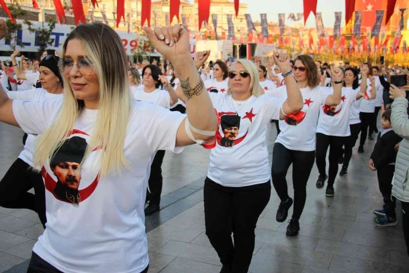 Gazi Mustafa Kemal Atatürk’ün resminin yer aldığı tişörtleri giyen 98 kadının zeybek gösterisine çok sayıda vatandaş da ellerindeki Türk bayraklarıyla kadınlara destek verdi. Şölen havasında geçen etkinlikte kadınlar, marşlar eşliğinde Cumhuriyet Bayramı’nı kutlarken, vatandaşlar da çektikleri fotoğraf ve videolar ile anı ölümsüzleştirdi.