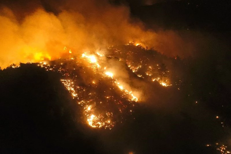 Aydın Çine’de akşam saatlerinde başlayan yangın gece boyunca belirli noktalarda etkisini sürdürdü. Ekiplerin adeta seferberlik içerisinde müdahale ettiği alevler havadan görüntülendi.