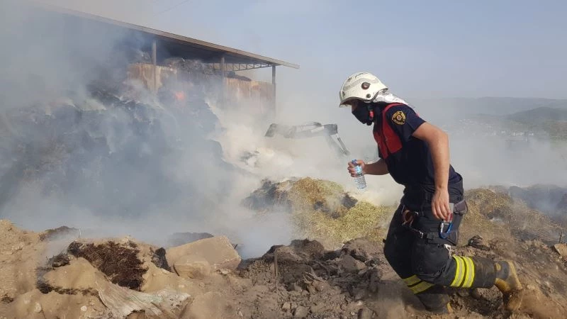 Aydın’ın Kuyucak ilçesindeki bir hayvan çiftliğinde meydana gelen yangında tonlarca saman alev alırken, itfaiye ekiplerinin söndürme çalışmaları devam ediyor.