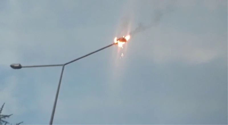 Çorum’da aydınlatma direğindeki lambalardan biri bir anda alev alıp yandı.