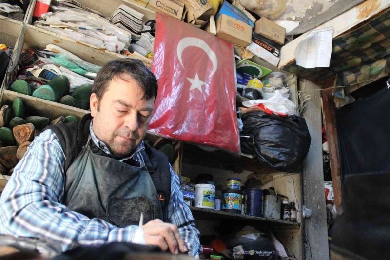 Aydın’da çırak olarak geldiği atölyede usta olarak devam eden ayakkabı tamir ustası Murat Yardım’ın (46), işyerine astığı Türk Bayrağı’nın yıpranmaması ve kirlenmemesi için aldığı önlem takdir topladı.