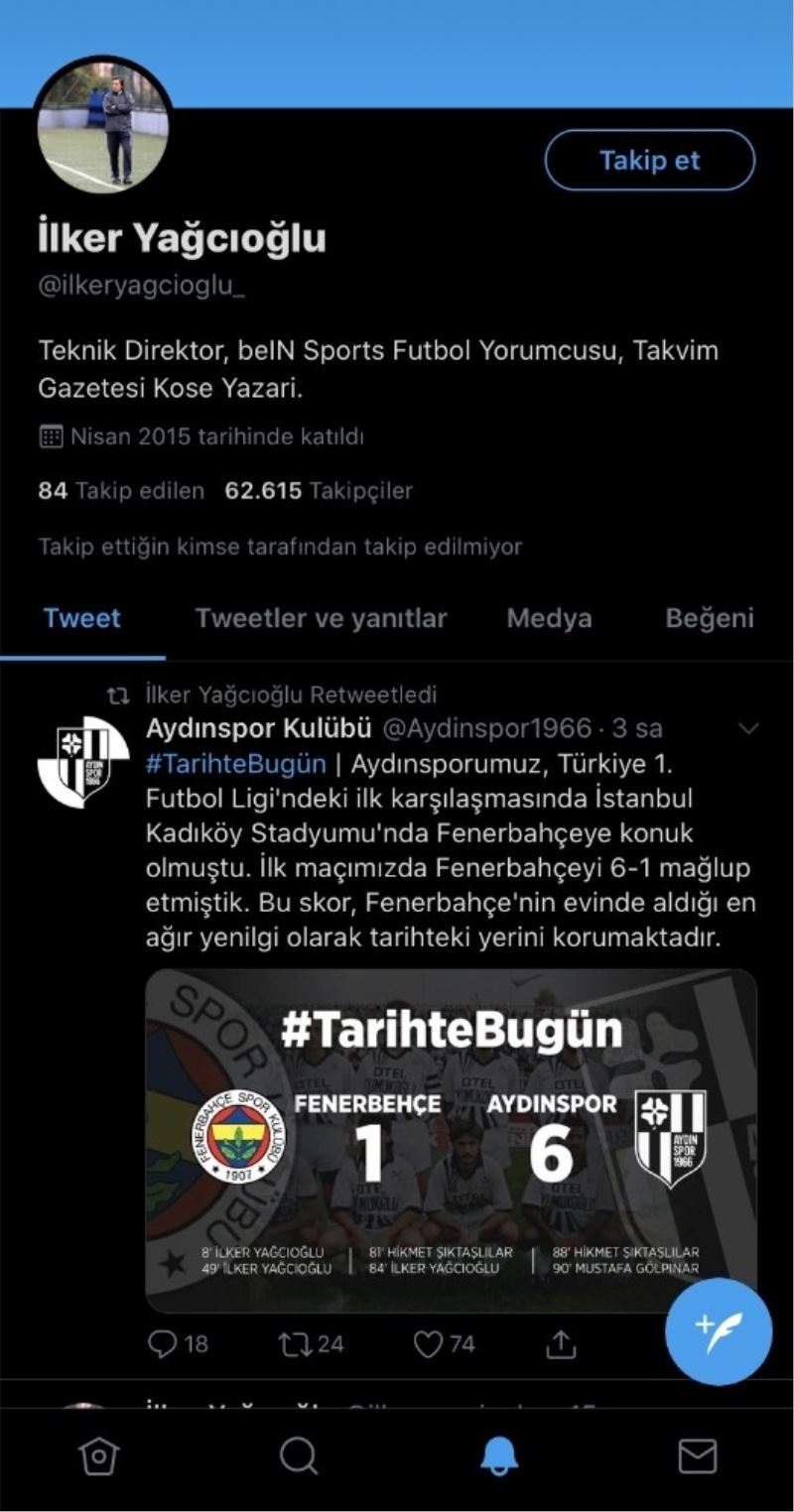 Aydınspor’un 6-1 galip geldiği karşılaşmada 3 gol atan İlker Yağcıoğlu, tarihi galibiyeti resmi Twitter hesabından (@ilkeryagcioglu_) retweet ederek takipçileriyle paylaştı.