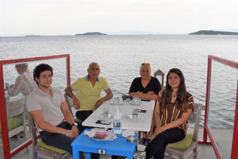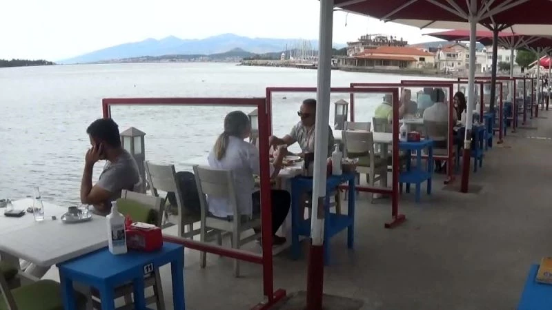 Urla ilçesindeki işletmeler, haftalar sonra müşterilerini ağırlamaya başladı. Sahil kenarındaki işletmeler, masalarını sosyal mesafe kurallarına göre hazırlayıp cam bölme çekerken, hijyene dikkat etti. Gelen konukların ise girişte ateşi ölçüldü. Misafirlere ayrıca hem dezenfektan hem de maske dağıtıldığı gözlendi.