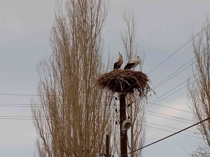 Van’ın Özalp ilçesinde ilkbahar mevsiminde aynı elektrik direğine yuva yapan leylekler köyün simgesi haline geldi.