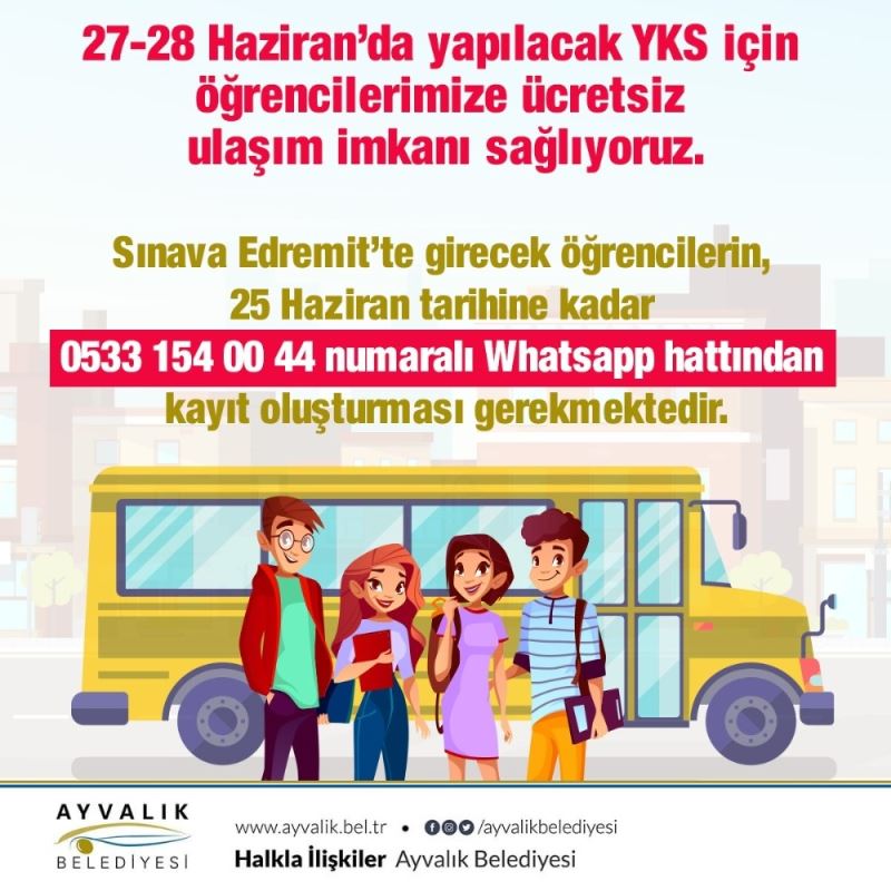 Öğrenci Seçme ve Yerleştirme Merkezi (ÖSYM) tarafından 27-28 Haziran’da yapılacak olan Yükseköğretim Kurumları Sınavı’na (YKS) katılacak adaylar için Ayvalık Belediyesi, ücretsiz otobüs kaldıracağını açıkladı.