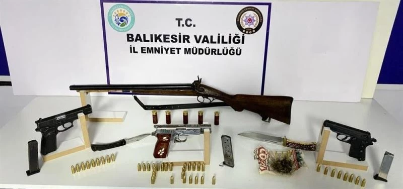 Bir otomobilde yapılan aramada ikisi kuru sıkı 3 tabanca, 6 tüfek ele geçirildi. Aynı çalışmalar kapsamında Balıkesir plakalı bir otomobilde yapılan aramalarda, 4.65 gram esrar, 38 adet 9 mm çapında fişek ele geçirildi. Polis ekiplerinin araçta bulunan fişekler sonrası yapılan araç sahibinin evinde yaptıkları aramalarda ise; 1 adet 9 mm çapında ruhsatsız tabanca ve 9 mm çapında 5 adet MKE Marka fişek, 2 adet kuru sıkı tabanca, 1 adet ibaresiz ruhsatsız tüfek, 5 adet av tüfeği fişeği, 2 adet bıçak ele geçirildi.
