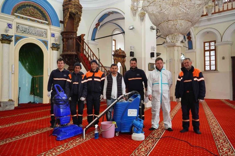 Balıkesir’in Ayvalık ilçesinde; Ayvalık Belediyesi, kent genelindeki camilerde Ramazan ayı öncesi dezenfeksiyon ve temizlik çalışmalarını gerçekleştiriyor.