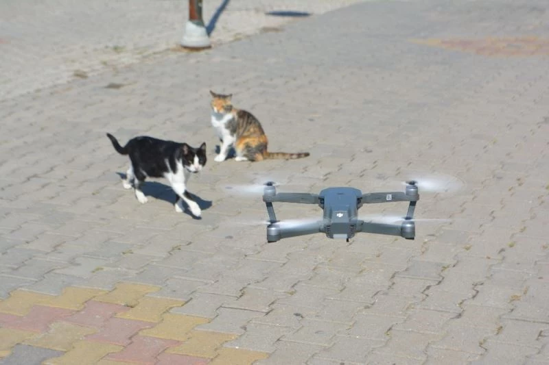 Dronu yere indirdiğinde hemen bir kedinin yanına giderek dronun pervanesine patisi ile vurmaya başladığını kaydeden Yavuz, “Sevimli kedi bu insansız hava aracını ilk kez gördü ve patileriyle bu cihazla tanışmış oldu” dedi.