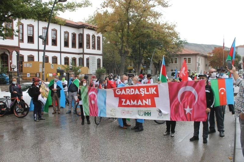 Çankırı’da bir grup bisiklet sporcusu, yağmur altında Azerbaycan’a destek ve Ermenistan saldırılarını kınamak için pedal çevirdi.